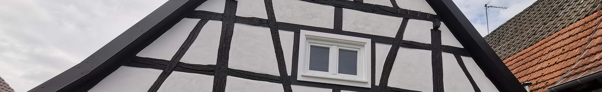 Rénovation d'une façade de maison à colombages. Enduit et peinture à la chaux
